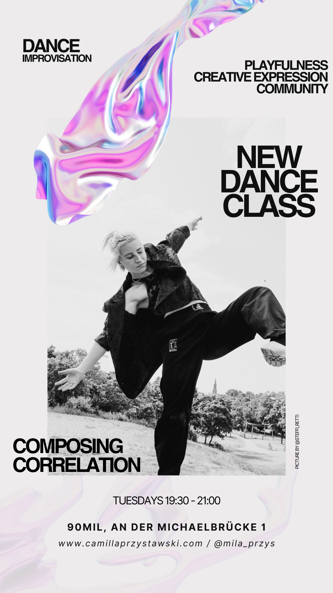 I want to share my practice and current explorations with you The focus of this workshop lies on the search for reactive and adaptive, as well as calm and soft bodies in order to move as effortlessly as possible and to establish a form of movement that is sustainable over long term. It is aimed at anyone who wants to expand and refine their range of motion, gather inspirations and share the space with others in a focused, yet joyful atmosphere.Based on sensory perception, imagination or concrete movements and sequences, we will derive movement principles that can be used and further developed for your own movement exploration and discovery.
